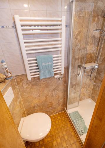 Zudem hat das Einzelzimmer ein separates Bad mit WC und Dusche, bestückt mit Handtuch, Badetuch und Fön.