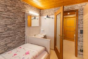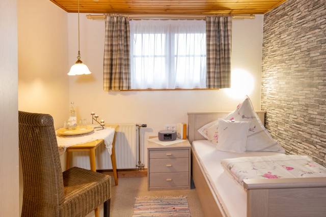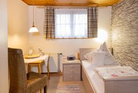 Das Einzelzimmer „Bergsteiger Südwand“ befindet sich im 2. OG des Hauses mit Blick nach Süden über eine Dachgaube.